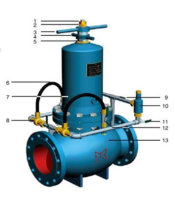 如右圖所示,ZJY46H活塞式減壓閥是由主閥和反饋系統(tǒng)組成。圖中所示為功能代號④的產(chǎn)品:雙反饋。可反沖排污、內(nèi)鎖定保護(hù)型。